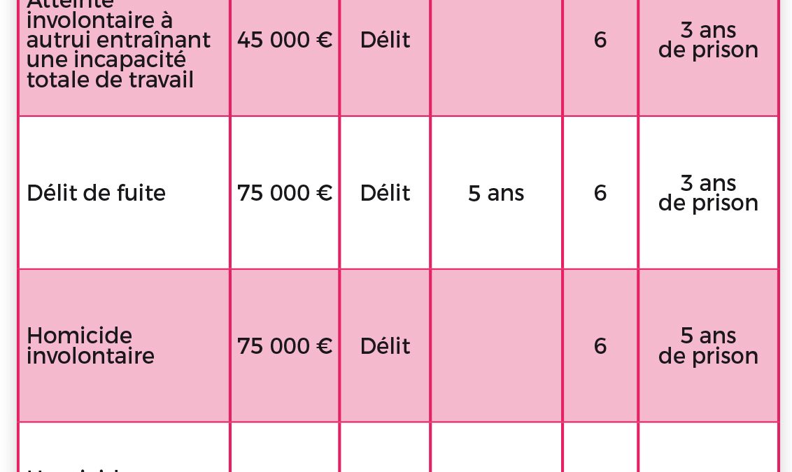 Les sanctions les plus sévères sont celles liées aux accidents de la circulation entraînant des blessures ou la mort. En cas de récidive, les sanctions sont généralement plus sévères. Ils peuvent aller jusqu'à 15 ans de prison.